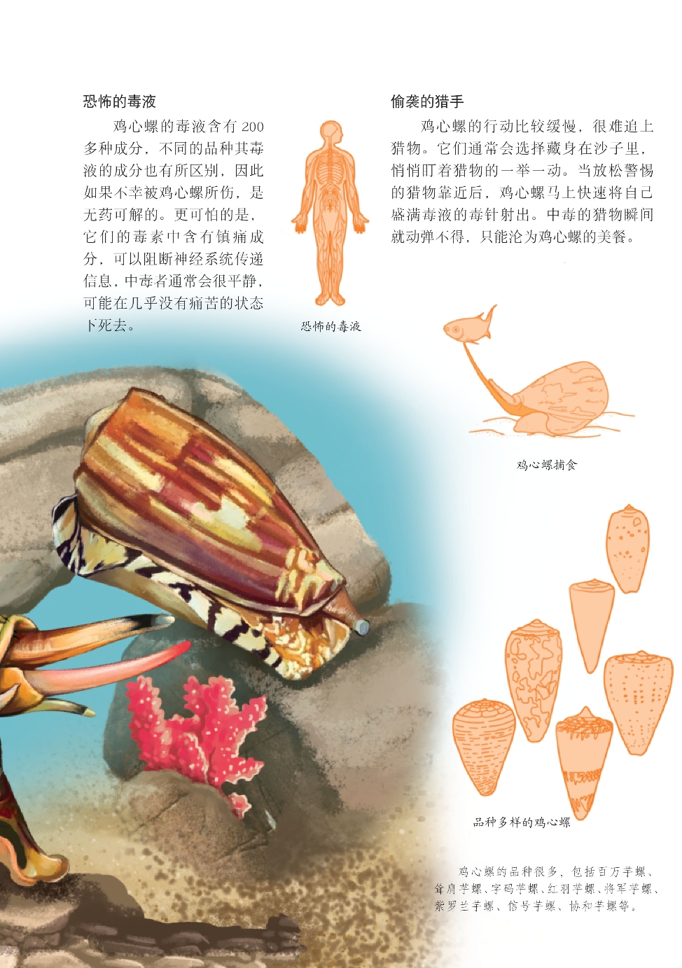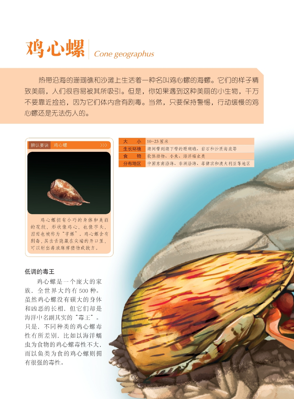 热带沿海的珊瑚礁和沙滩上生活着一种名叫鸡心螺的海螺。它们的样子精致美丽,人们很容易被其所吸引。但是,你如果遇到这种美丽的小生物,千万不要靠近捡拾,因为它们体内含有剧毒。当然,只要保持警惕,行动缓慢的鸡心螺还是无法伤人的。