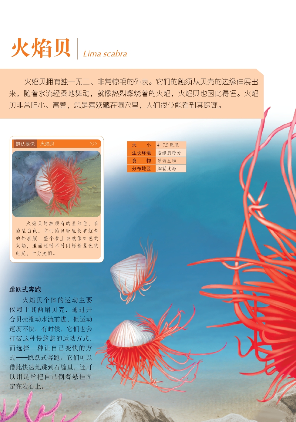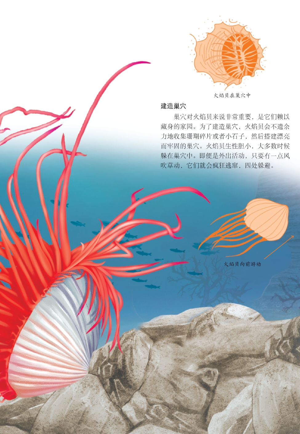 火焰贝拥有独一无二、非常惊艳的外表。它们的触须从贝壳的边缘伸展出来,随着水流轻柔地舞动,就像热烈燃烧着的火焰,火焰贝也因此得名。火焰贝非常胆小、害羞,总是喜欢藏在洞穴里,人们很少能看到其踪迹。