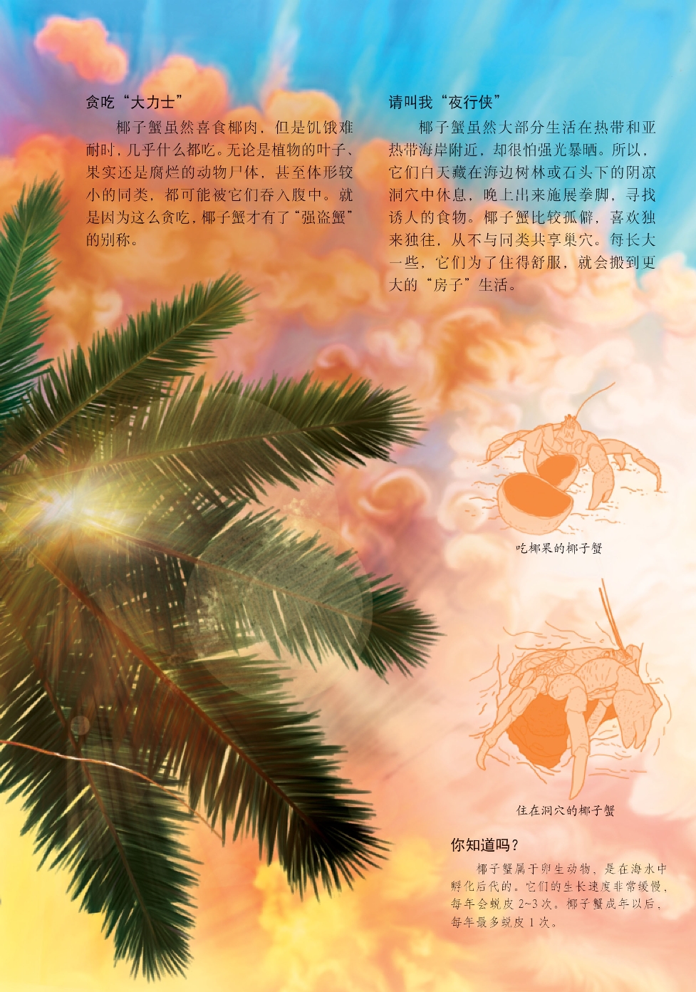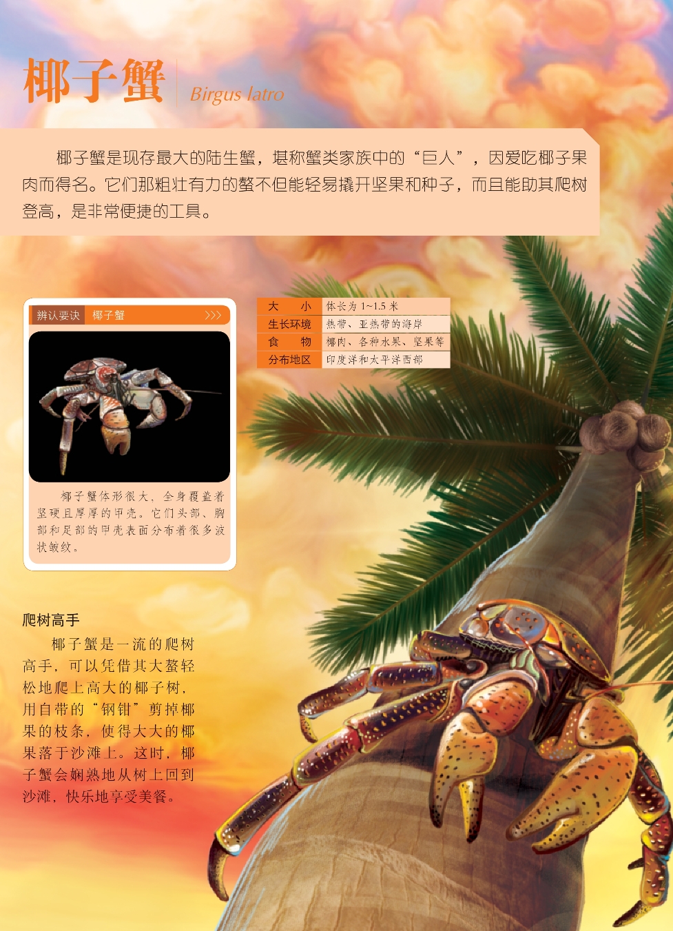 椰子蟹是现存最大的陆生蟹,堪称蟹类家族中的“巨人”,因爱吃椰子果肉而得名。它们那粗壮有力的螯不但能轻易撬开坚果和种子,而且能助其爬树登高,是非常便捷的工具。