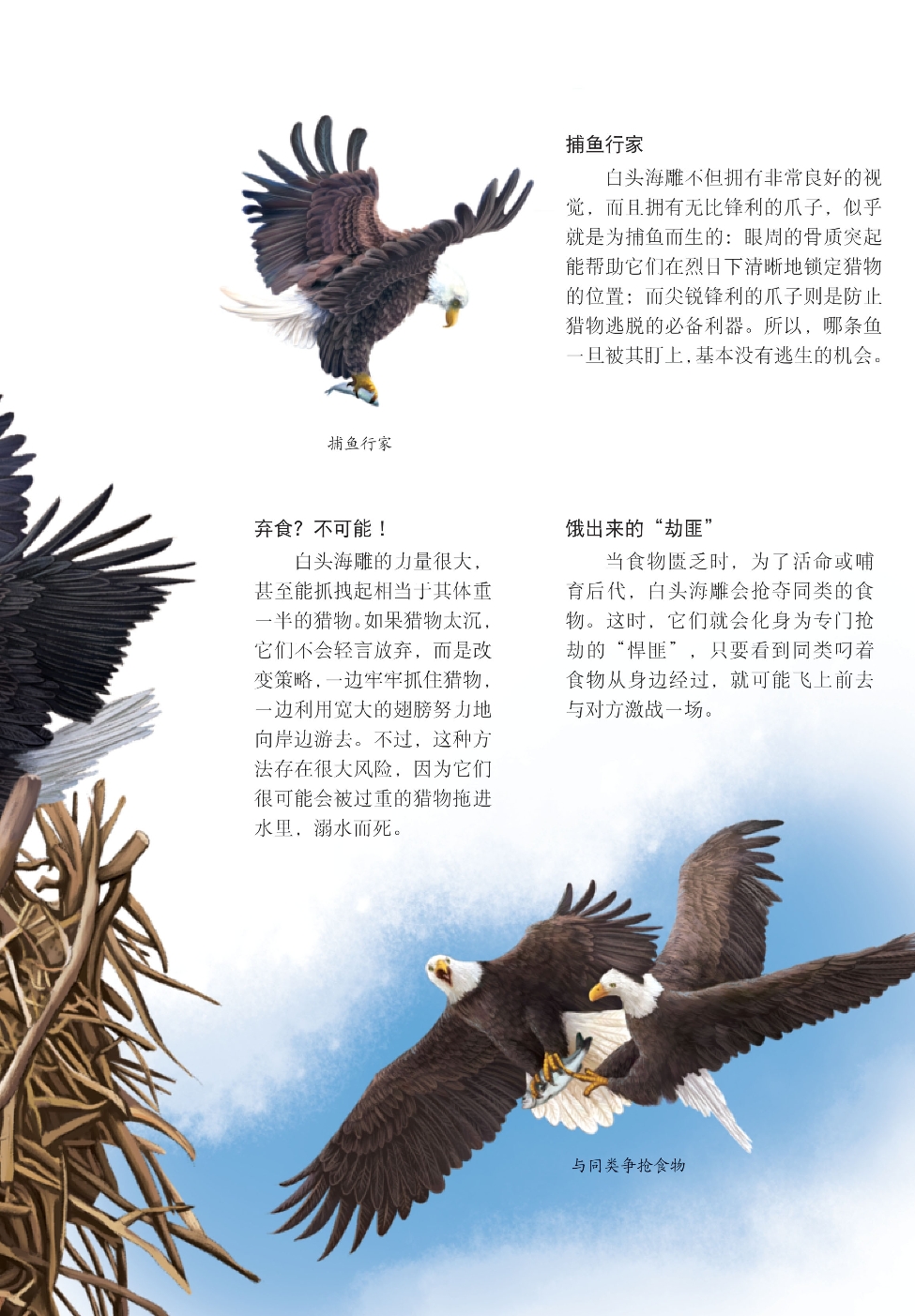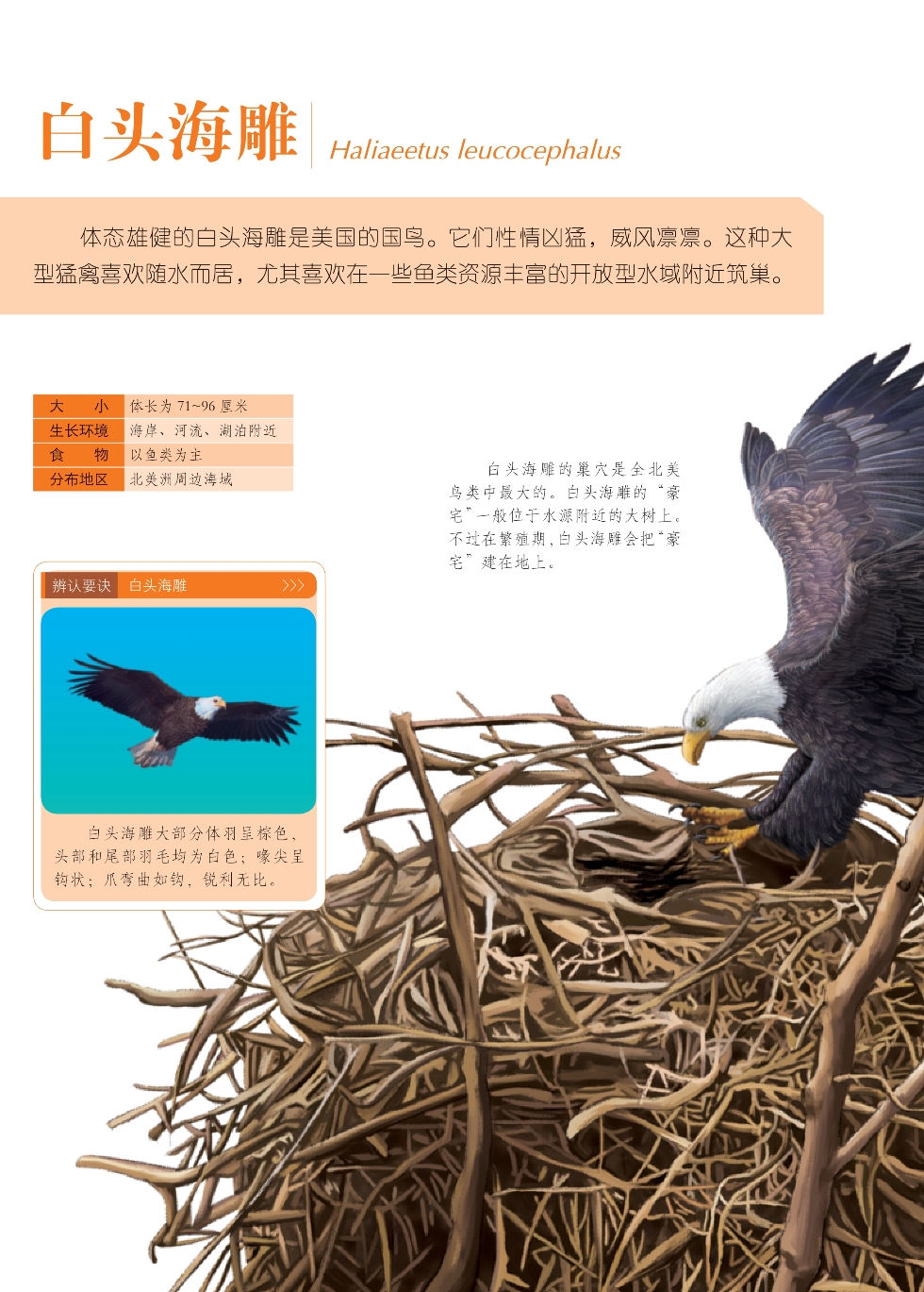 体态雄健的白头海雕是美国的国鸟。它们性情凶猛,威风凛凛。这种大型猛禽喜欢随水而居,尤其喜欢在一些鱼类资源丰富的开放型水域附近筑巢。
