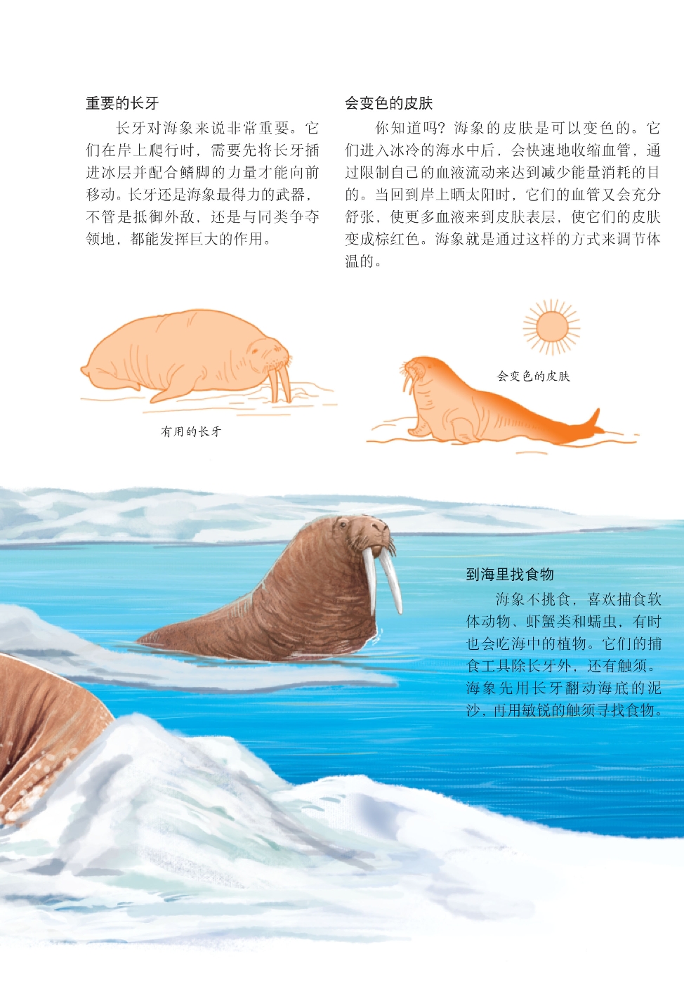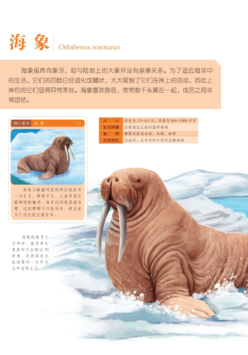 海象虽然有象牙,但与陆地上的大象并没有亲缘关系。为了适应海洋中的生活,它们的四肢已经退化成鳍状,大大限制了它们在岸上的活动,因此上岸后的它们显得异常笨拙。海象喜欢群居,常常数千头聚在一起,成员之间非常团结。