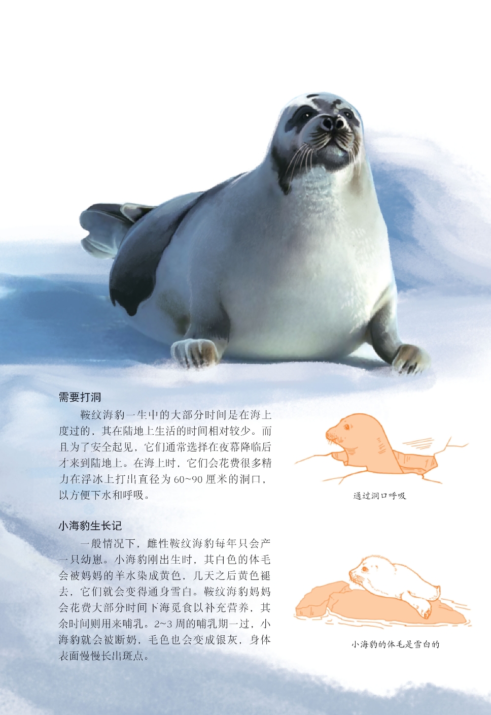 鞍纹海豹又叫“竖琴海豹”,因成年海豹背部有竖琴状鞍纹而得名。它们长期生活在极地地区,具有强大的耐寒能力,喜居于海冰附近,因此它们又有“恋冰海豹”的别称。