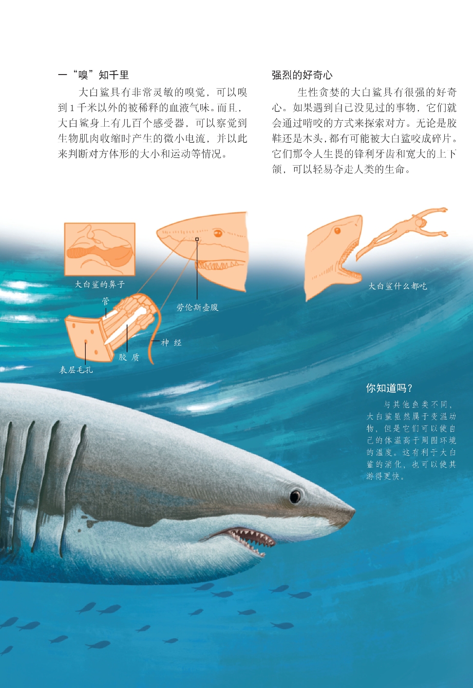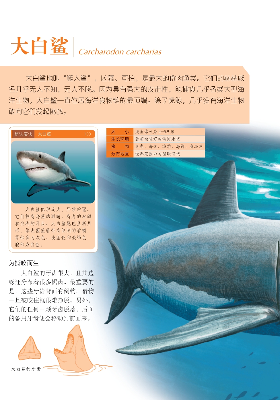 大白鲨也叫“噬人鲨”,凶猛、可怕,是最大的食肉鱼类。它们的赫赫威名几乎无人不知,无人不晓。因为具有强大的攻击性,能捕食几乎各类大型海洋生物,大白鲨一直位居海洋食物链的最顶端。除了虎鲸,几乎没有海洋生物敢向它们发起挑战。