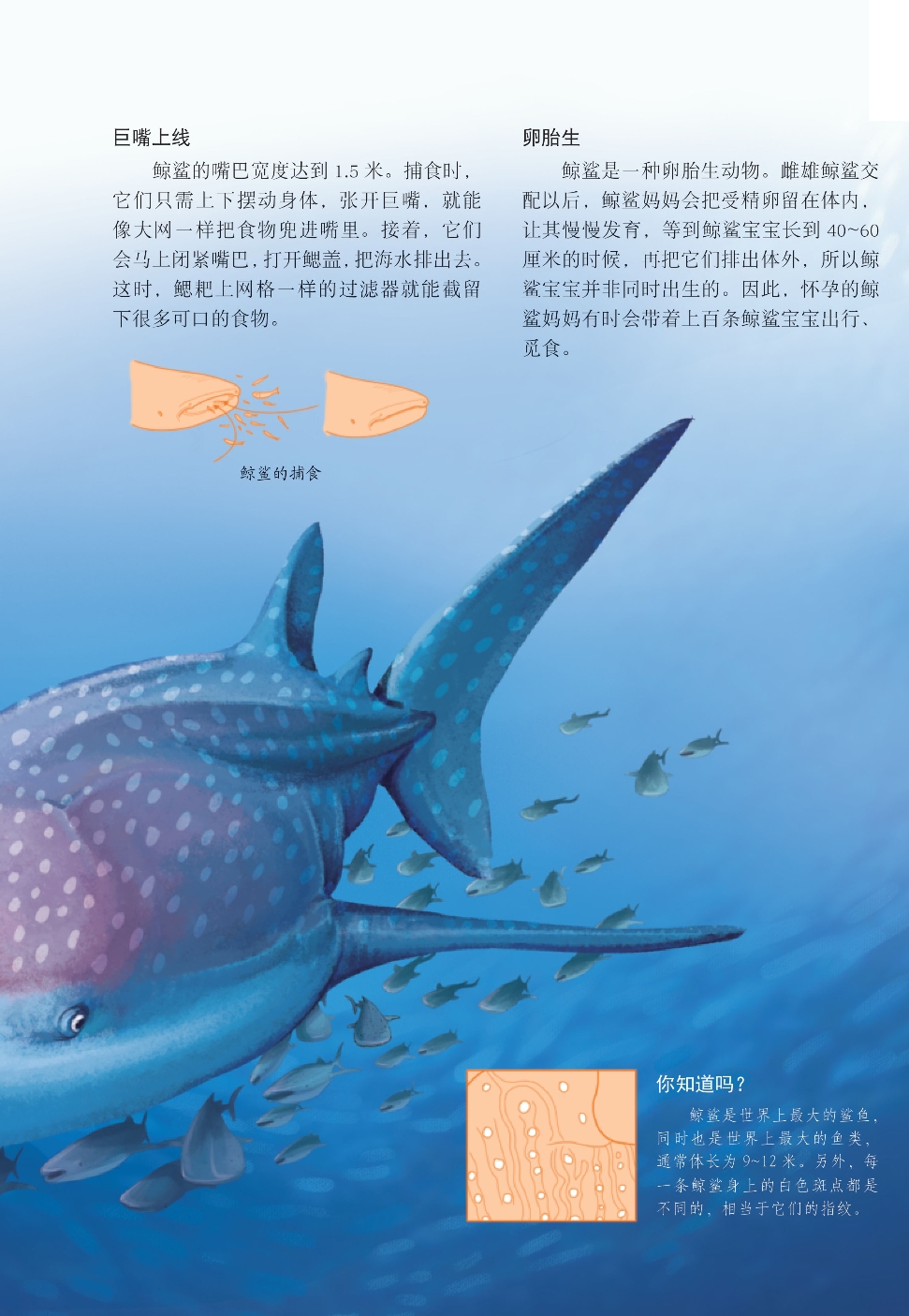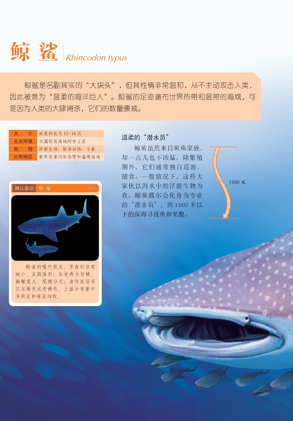 鲸鲨是名副其实的“大块头”,但其性情非常温和,从不主动攻击人类,因此被誉为“温柔的海洋巨人”。鲸鲨的足迹遍布世界热带和温带的海域,可是因为人类的大肆捕杀,它们的数量骤减。