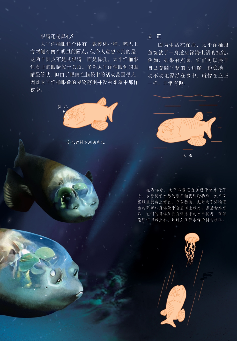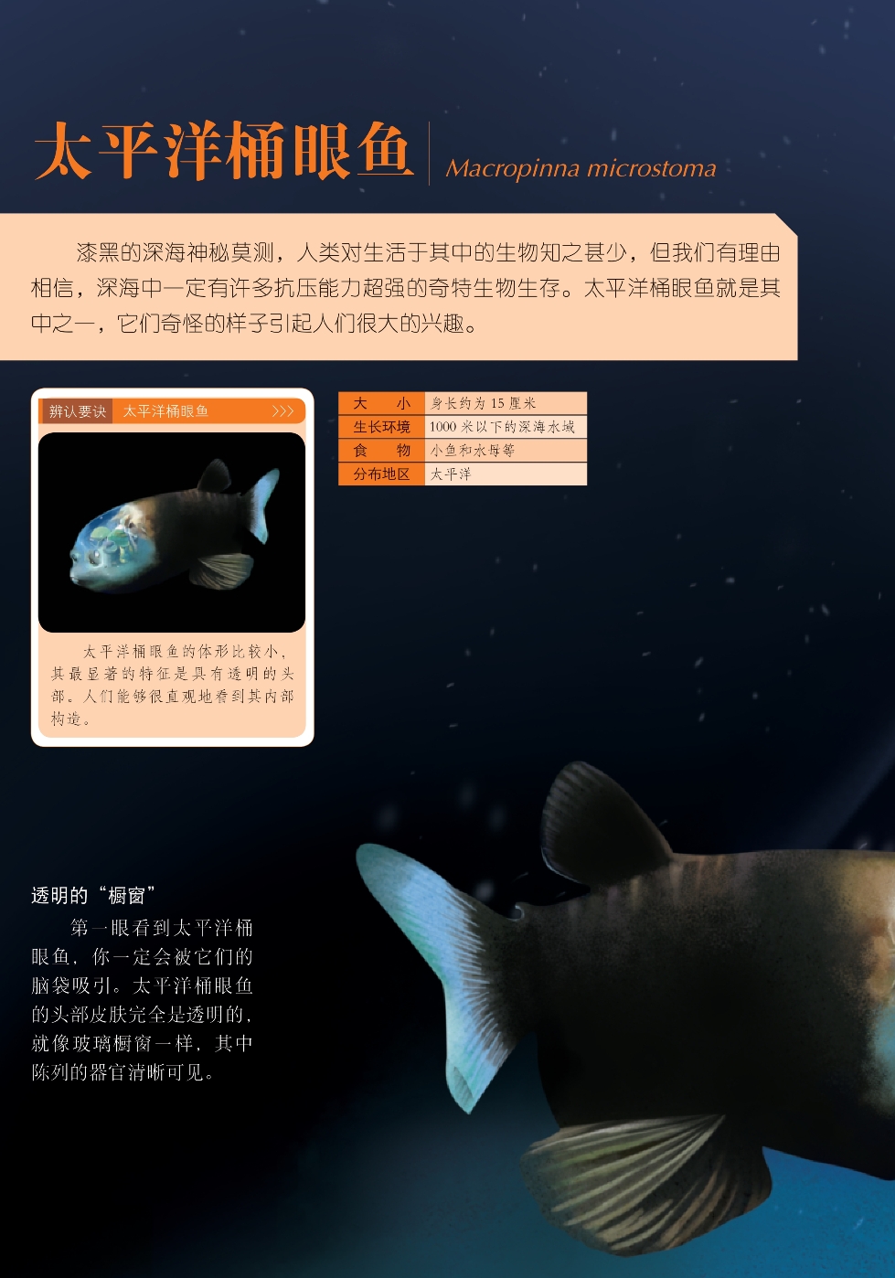 漆黑的深海神秘莫测,人类对生活于其中的生物知之甚少,但我们有理由相信,深海中一定有许多抗压能力超强的奇特生物生存。太平洋桶眼鱼就是其中之一,它们奇怪的样子引起人们很大的兴趣。