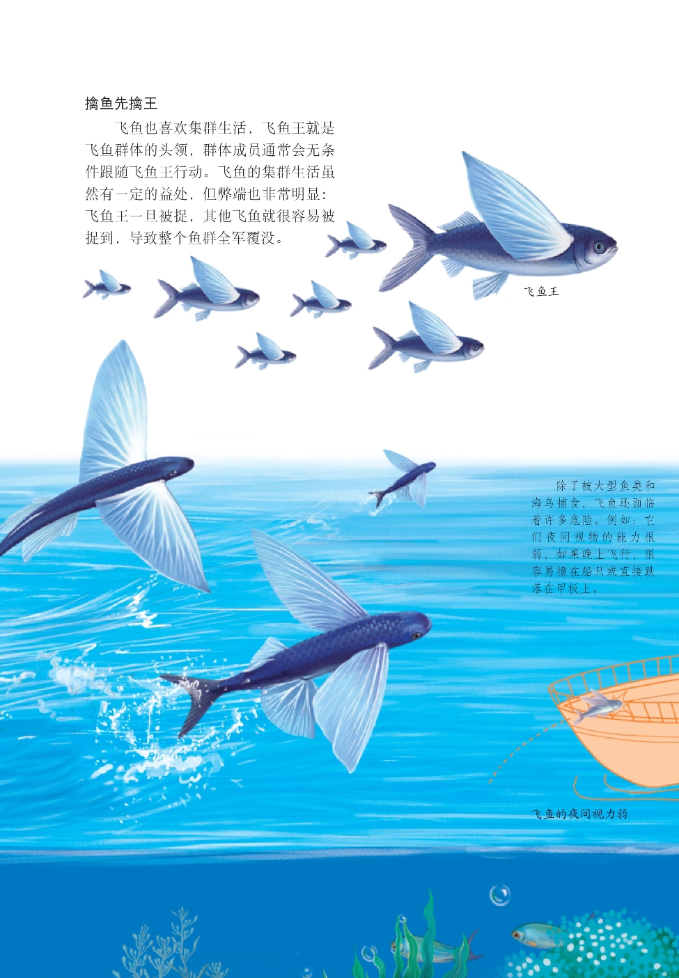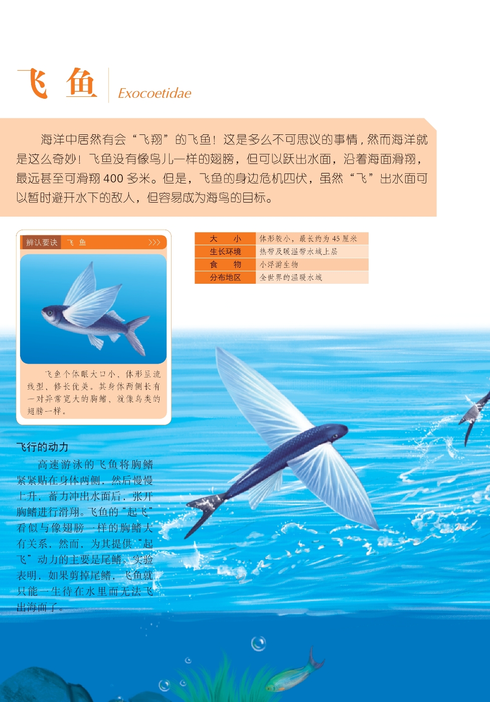 海洋中居然有会“飞翔”的飞鱼!这是多么不可思议的事情,然而海洋就是这么奇妙!飞鱼没有像鸟儿一样的翅膀,但可以跃出水面,沿着海面滑翔,最远甚至可滑翔400多米。但是,飞鱼的身边危机四伏,虽然“飞”出水面可以暂时避开水下的敌人,但容易成为海鸟的目标。