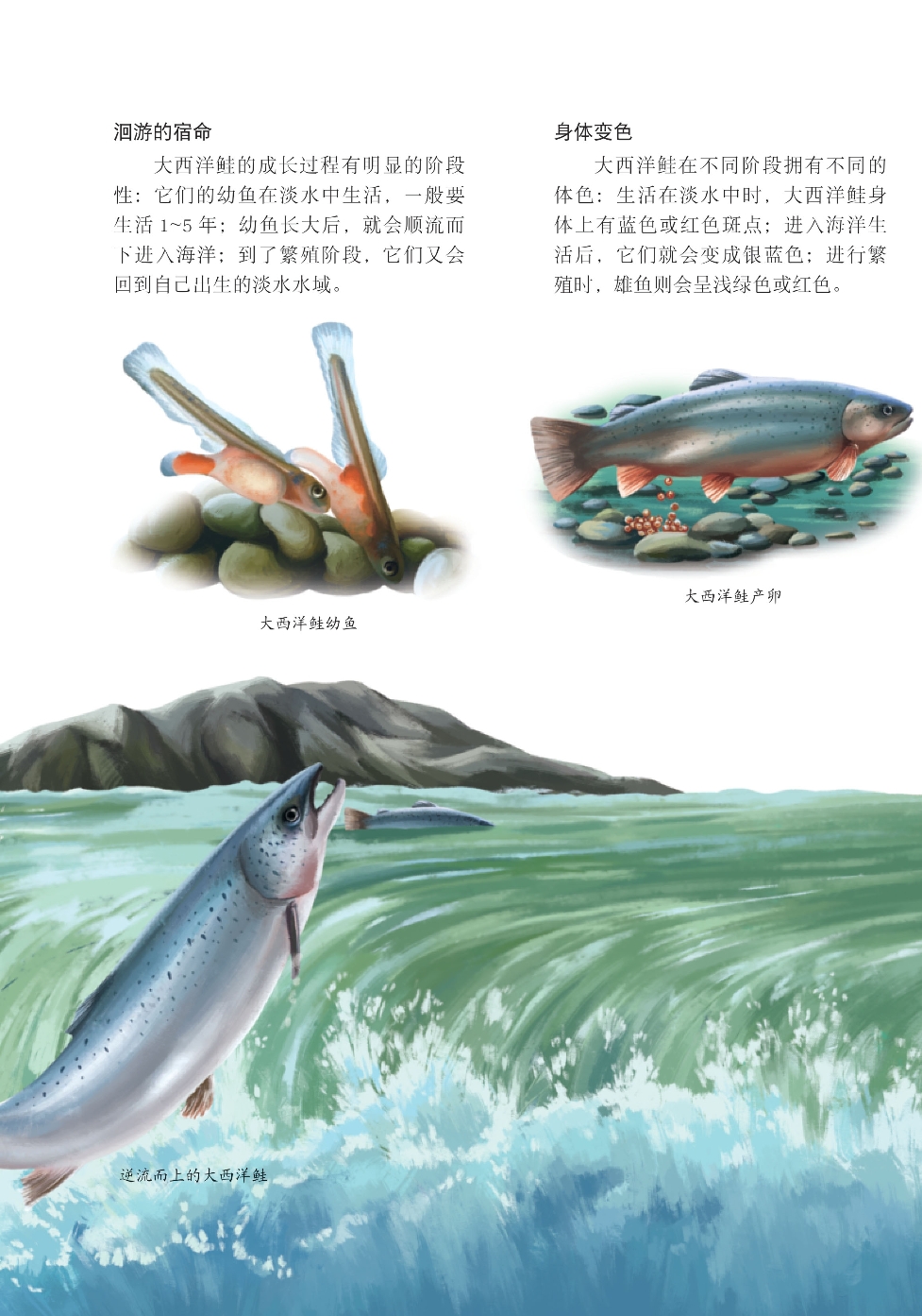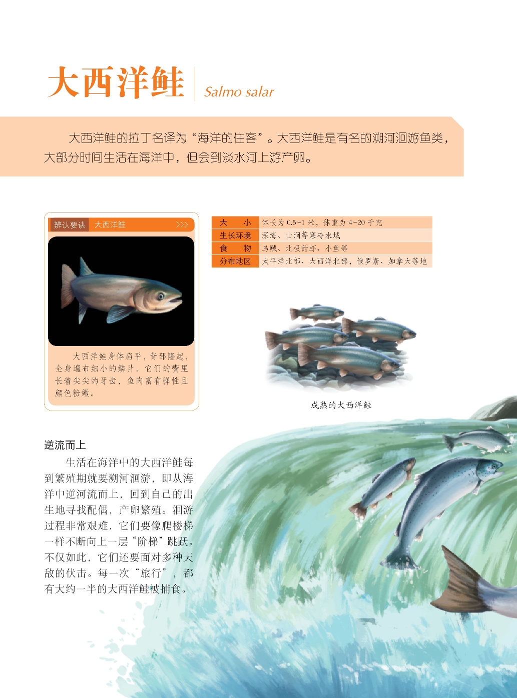大西洋鲑的拉丁名译为“海洋的住客”。大西洋鲑是有名的溯河洄游鱼类,大部分时间生活在海洋中,但会到淡水河上游产卵。