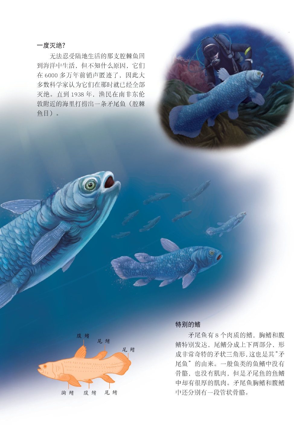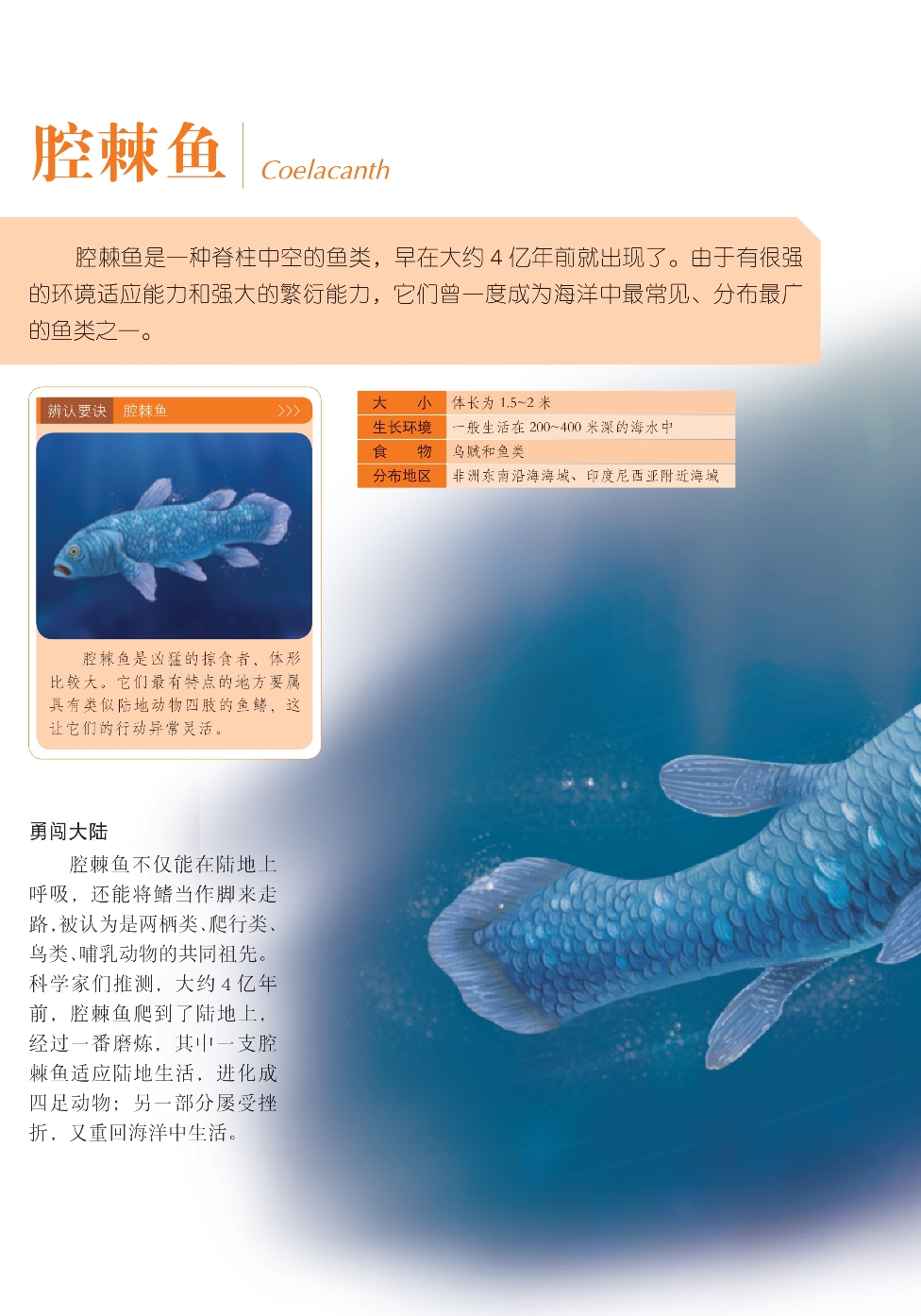 腔棘鱼是一种脊柱中空的鱼类,早在大约4亿年前就出现了。由于有很强的环境适应能力和强大的繁衍能力,它们曾一度成为海洋中最常见、分布最广的鱼类之一。
