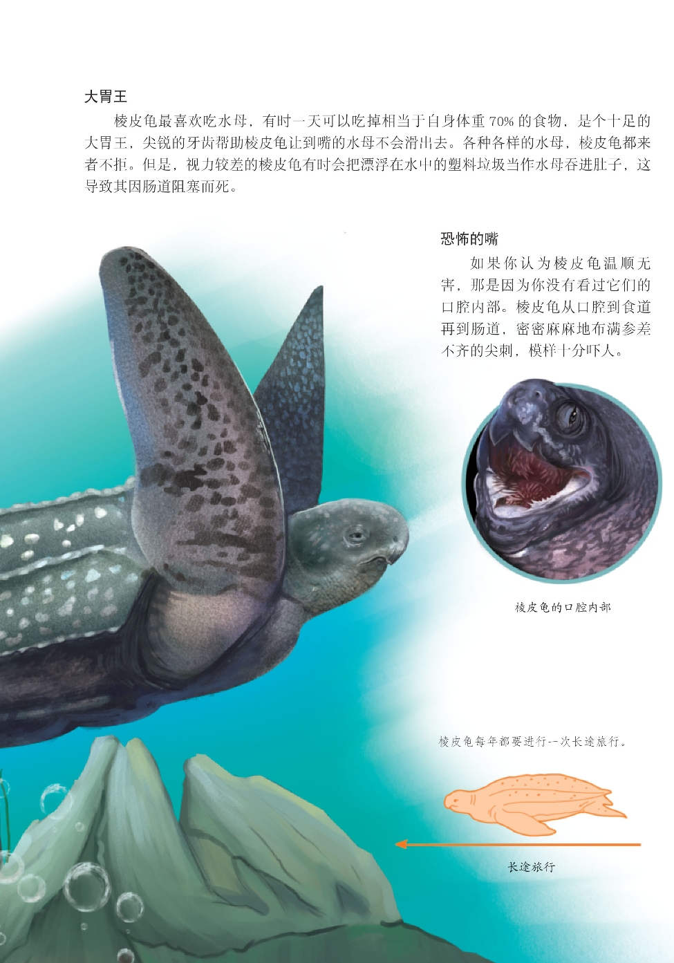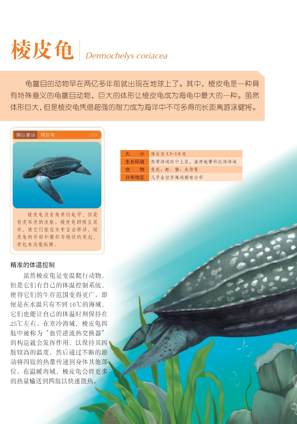 龟鳖目的动物早在两亿多年前就出现在地球上了。其中,棱皮龟是一种具有特殊意义的龟鳖目动物,巨大的体形让棱皮龟成为海龟中最大的一种。虽然体形巨大,但是棱皮龟凭借超强的耐力成为海洋中不可多得的长距离游泳健将。
