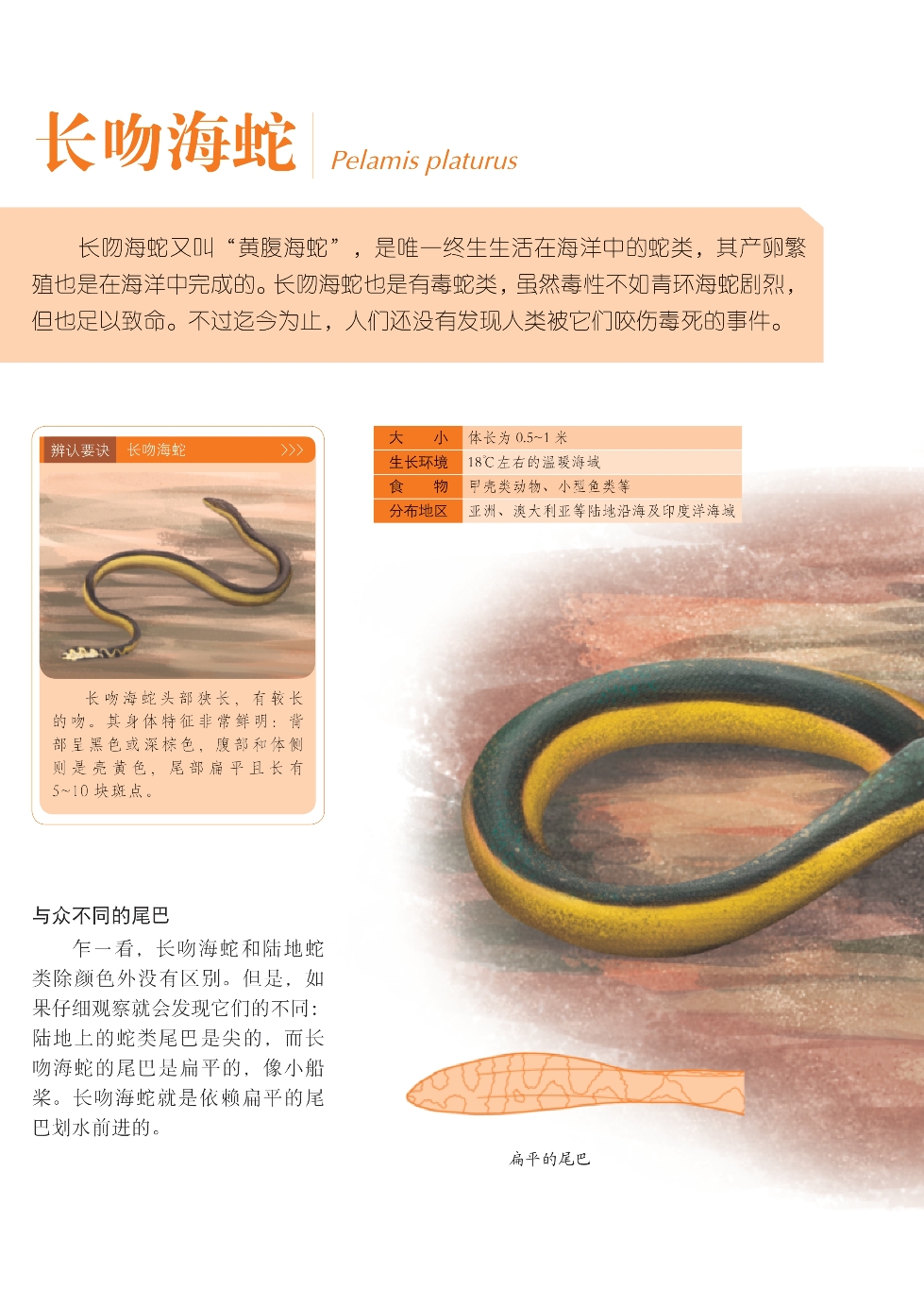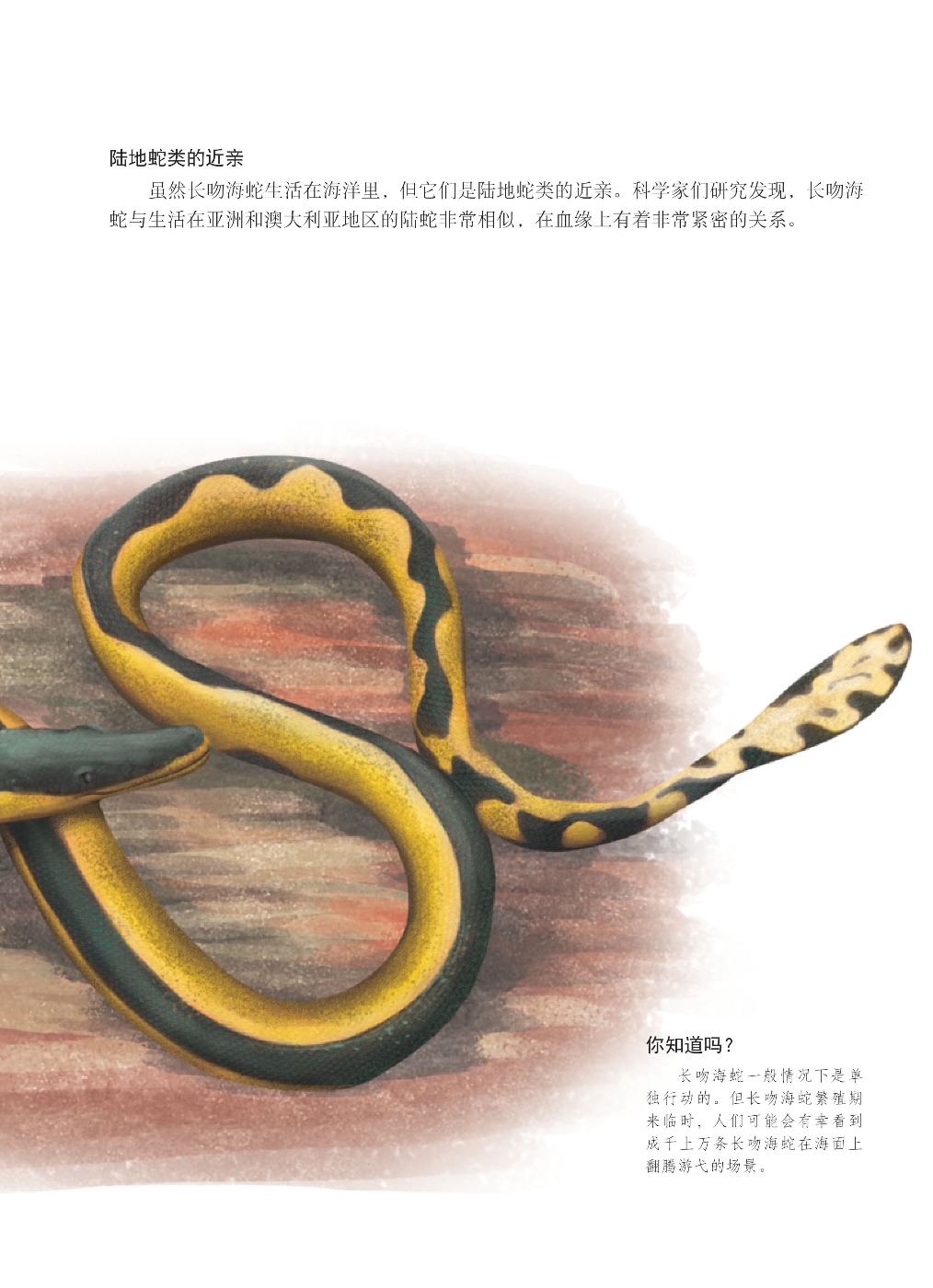长吻海蛇又叫“黄腹海蛇”,是唯一终生生活在海洋中的蛇类,其产卵繁殖也是在海洋中完成的。长吻海蛇也是有毒蛇类,虽然毒性不如青环海蛇剧烈,但也足以致命。不过迄今为止,人们还没有发现人类被它们咬伤毒死的事件。