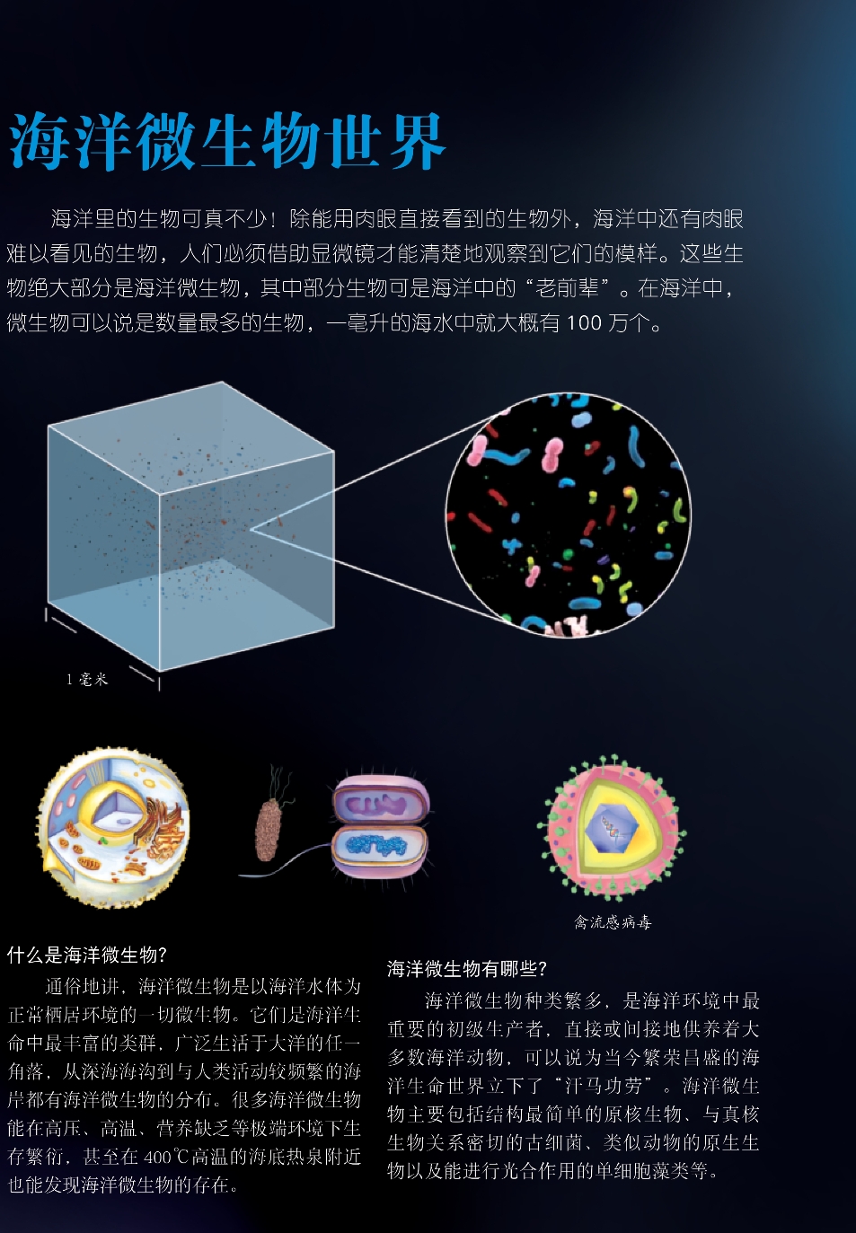 海洋里的生物可真不少!除能用肉眼直接看到的生物外,海洋中还有肉眼难以看见的生物,人们必须借助显微镜才能清楚地观察到它们的模样。这些生物绝大部分是海洋微生物,其中部分生物可是海洋中的“老前辈”。在海洋中,微生物可以说是数量最多的生物,一毫升的海水中就大概有100万个。