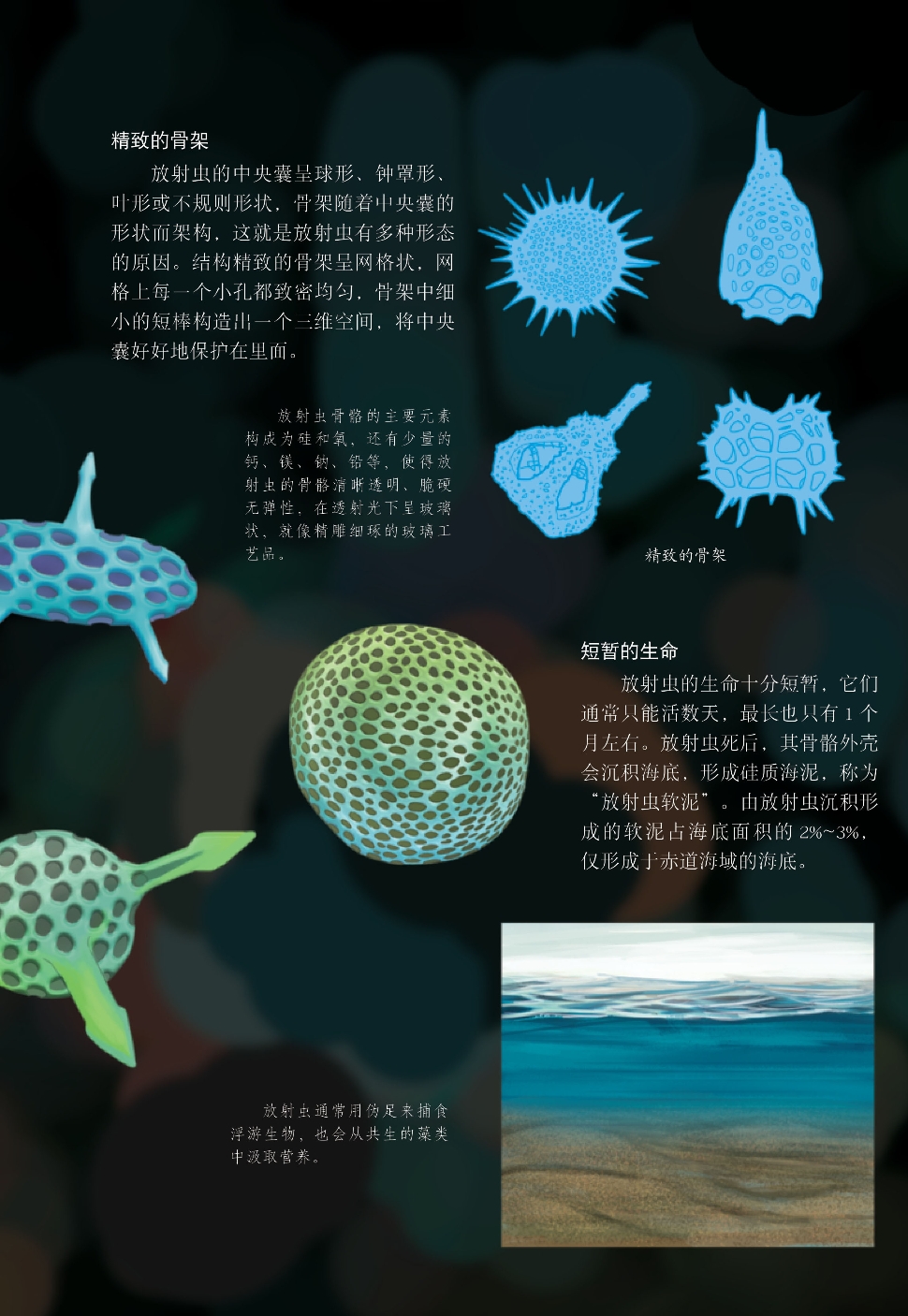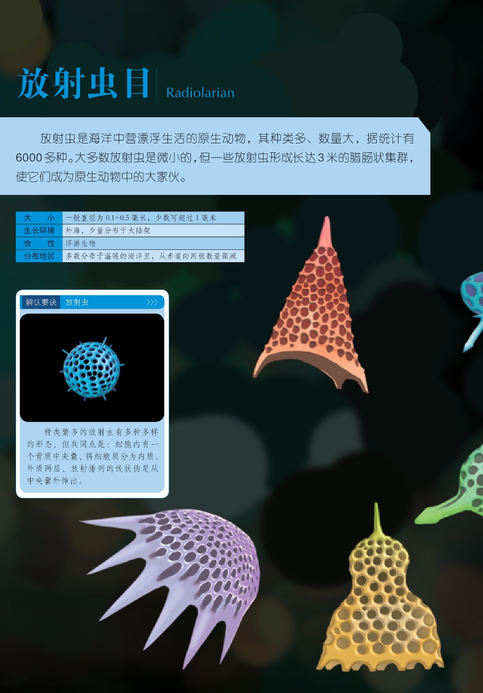 放射虫是海洋中营漂浮生活的原生动物,其种类多、数量大,据统计有6000多种。大多数放射虫是微小的,但一些放射虫形成长达3米的腊肠状集群,使它们成为原生动物中的大家伙。