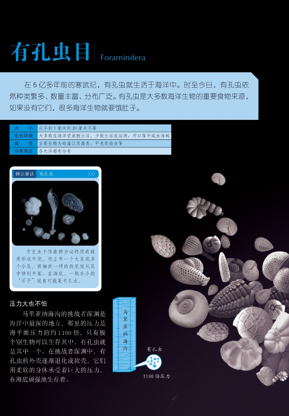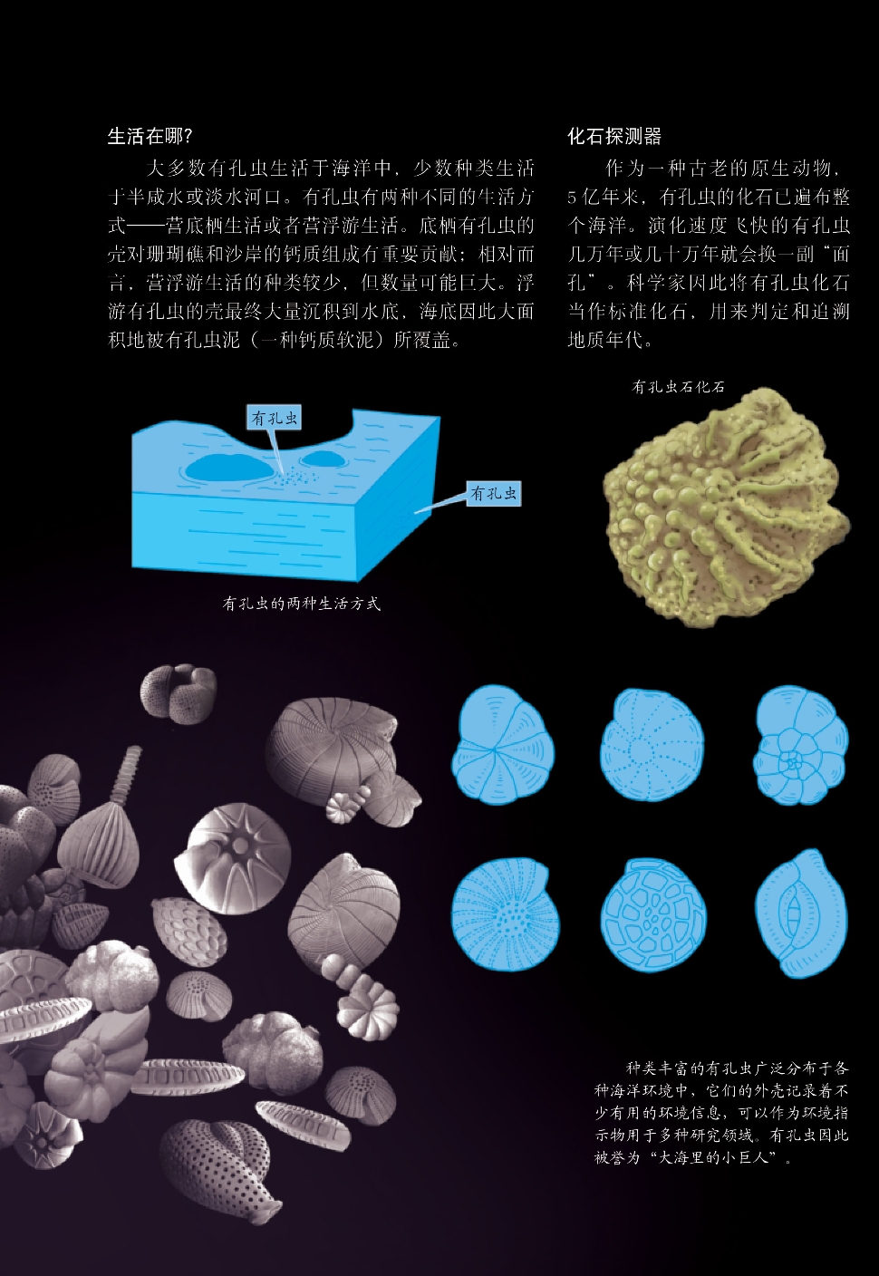 在5亿多年前的寒武纪,有孔虫就生活于海洋中。时至今日,有孔虫依然种类繁多、数量丰富、分布广泛。有孔虫是大多数海洋生物的重要食物来源,如果没有它们,很多海洋生物就要饿肚子。