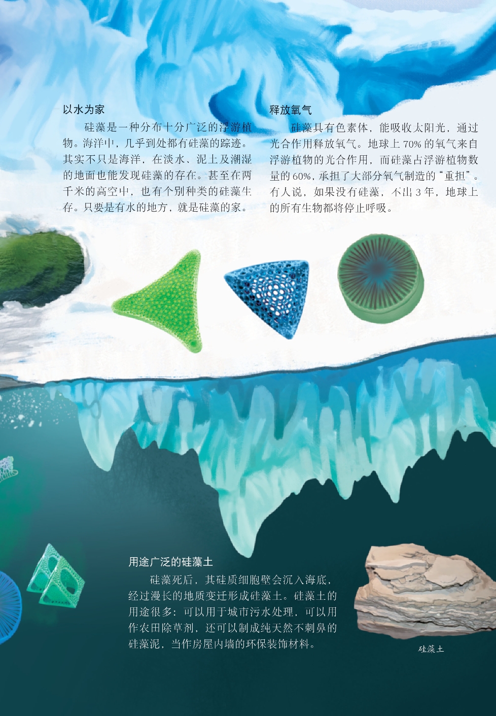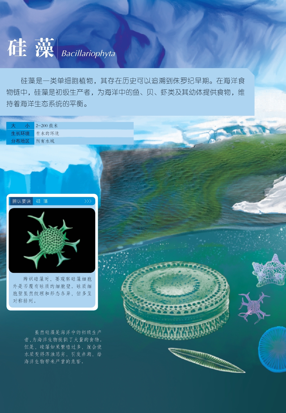 硅藻是一类单细胞植物,其存在历史可以追溯到侏罗纪早期。在海洋食物链中,硅藻是初级生产者,为海洋中的鱼、贝、虾类及其幼体提供食物,维持着海洋生态系统的平衡。