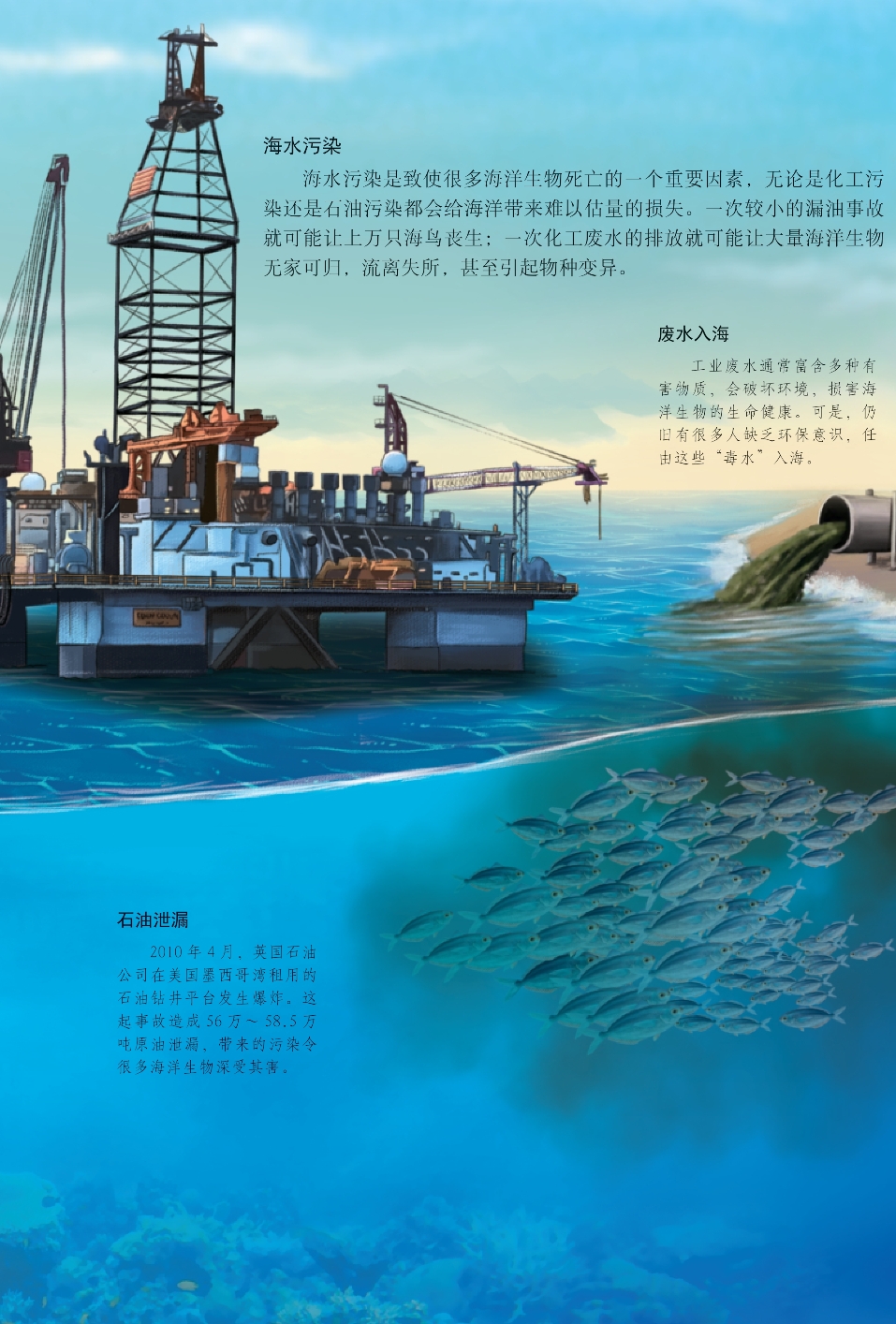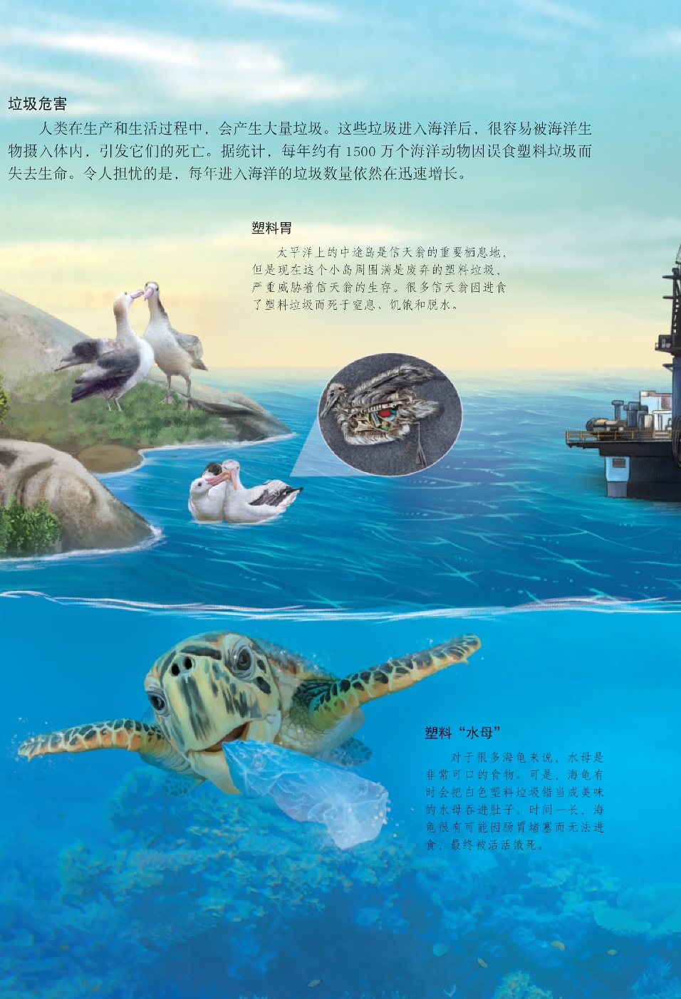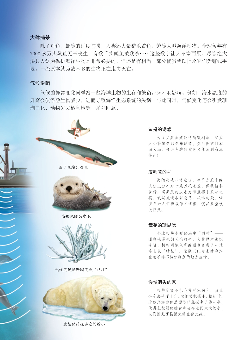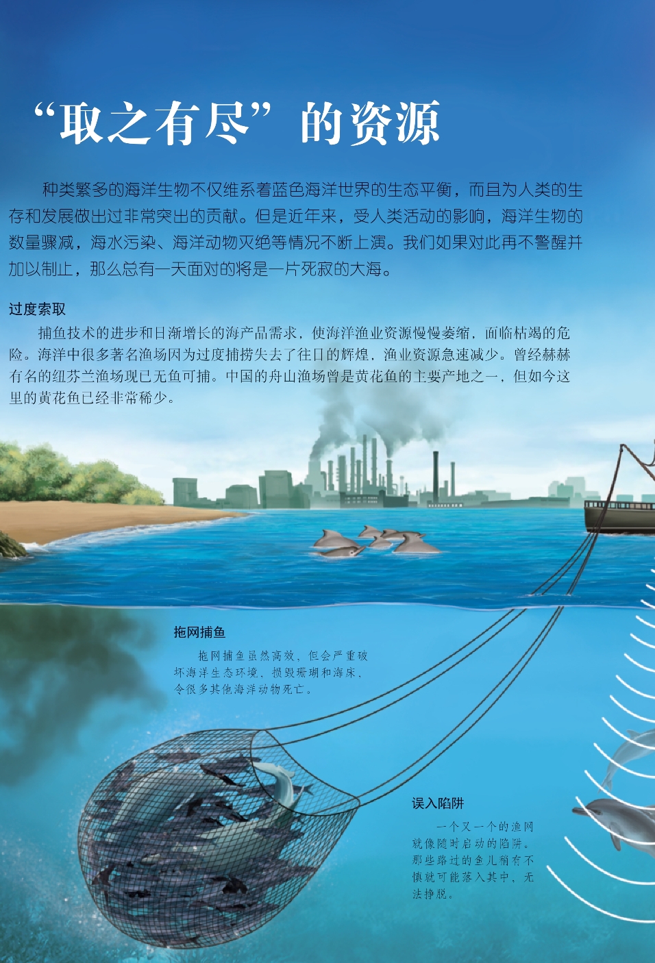 种类繁多的海洋生物不仅维系着蓝色海洋世界的生态平衡,而且为人类的生存和发展做出过非常突出的贡献。但是近年来,受人类活动的影响,海洋生物的数量骤减,海水污染、海洋动物灭绝等情况不断上演。我们如果对此再不警醒并加以制止,那么总有一天面对的将是一片死寂的大海。