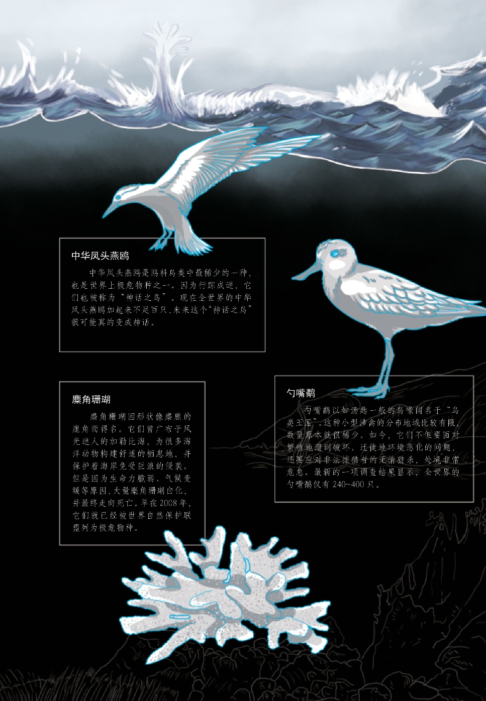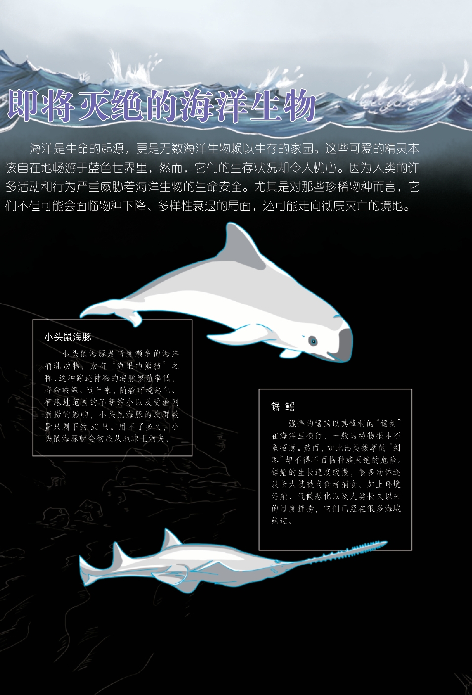 海洋是生命的起源,更是无数海洋生物赖以生存的家园。这些可爱的精灵本该自在地畅游于蓝色世界里,然而,它们的生存状况却令人忧心。因为人类的许多活动和行为严重威胁着海洋生物的生命安全。尤其是对那些珍稀物种而言,它们不但可能会面临物种下降、多样性衰退的局面,还可能走向彻底灭亡的境地。