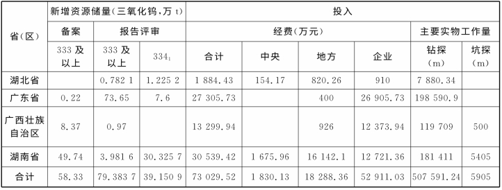 表1-4 中南地区钨矿勘查投入及新增资源储量表(2011—2015年)