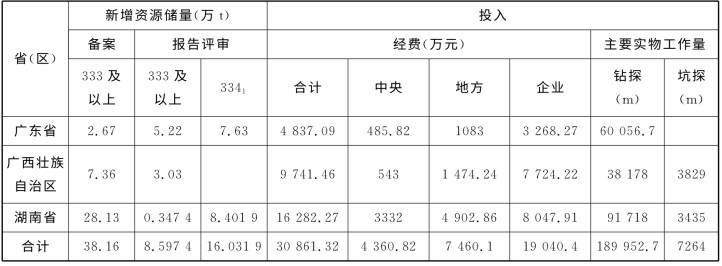 2011—2015年中南地区钨矿累计投入勘查资金73 029.52 万元,其中中央财政投入1 830.13万元、省级财政投入18 288.36 万元、社会资金投入52 911.03 万元。完成钻探507 591.24m、坑探5905m,新增查明钨矿(三氧化钨)资源储量(333及以上)137.713 7万t(备案资源储量58.33万t,项目评审资源储量79.383 7万t)(表1-4)。锡矿累计投入勘查资金30 861.32万元,其中中央财政投入4 360.82万元、省级财政投入7 460.1万元、社会资金投入19 040.4万元。完成钻探189 952.7m、坑探7264m,新增查明锡金属资源储量(333及以上)46.757 4万t(备案资源储量38.16万t,项目评审资源储量8.597 4万t)(表1-5)。新增大中型钨锡矿产地26处(其中大型矿产地9处)。