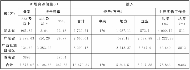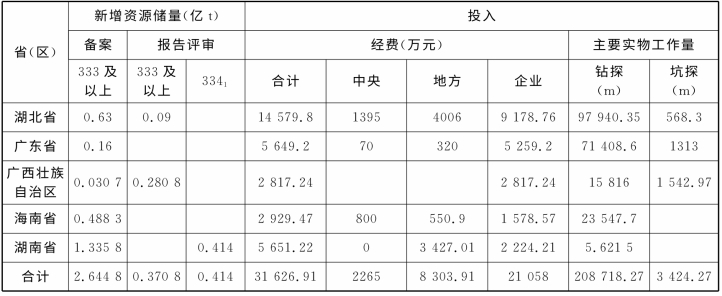 2011—2015年中南地区铁累计投入勘查资金31 626.91万元,其中中央财政投入2265万元、省级财政投入8 303.91万元、社会资金投入21 058万元。完成钻探208 718.27m、坑探3 424.27m。铁矿主要分布于湖北省、湖南省,新增查明铁矿石资源储量(333 及以上)3.015 6亿t(备案资源储量2.644 8亿t,项目评审资源储量0.370 8亿t)(表1-9),以高磷铁矿及低品位钒钛磁铁矿为主。