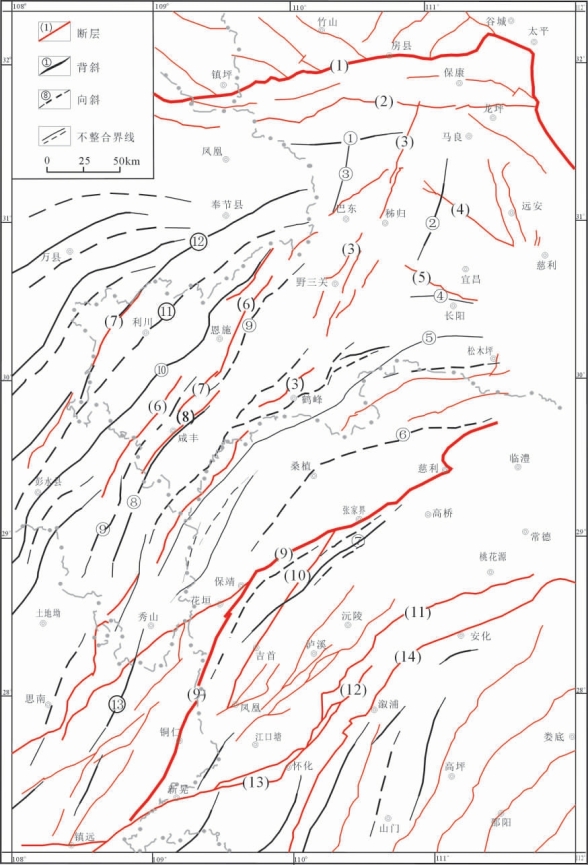 (1)襄(樊)-广(济)断裂带;(2)阳日断裂;(3)新华断裂;(4)雾渡河断裂带;(5)天阳坪-监利断裂带;(6)建始-恩施断裂带;(7)齐岳山断裂带;(8)咸丰断裂;(9)花垣-张家界(慈利)断裂带;(10)吉首-古丈断裂;(11)沅陵-麻阳断裂带;(12)辰溪-怀化断裂带;(13)凯里-新晃-芷江断裂带;(14)安化-溆浦-四堡断裂带;①神农架复背斜;②黄陵背斜;③秭归向斜;④长阳复背斜;⑤宜都-鹤峰复背斜;⑥桑植-石门复向斜;⑦古丈-吉首复背斜;⑧咸丰背斜;⑨花果坪复向斜;○10恩施复背斜;○1利川复向斜;○12齐岳山复背斜;○13梵净山穹隆