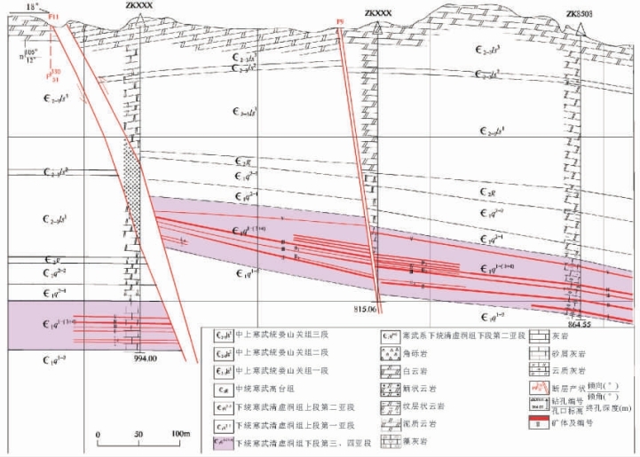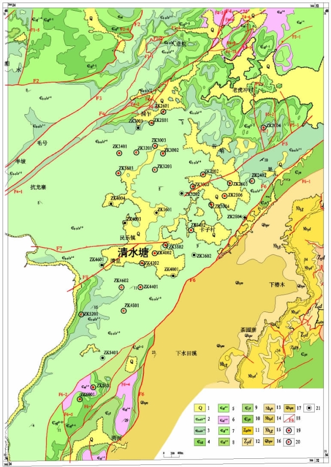 1.第四系;2~3.中上寒武统娄山关组第一段下亚段、上亚段;4.中寒武统高台组;5~8.下寒武统清虚洞组下段第四亚段、第三亚段(含矿岩层)、第二亚段、第一亚段;9.下寒武统石牌组;10.下寒武统牛蹄塘组;11.上震旦统灯影组;12.陡山沱组;13.上南华统南沱组;14.下南华统大塘坡组;15.古城组;16.上青白口统五强溪组;17.下青白口统马底驿组;18.断层及编号;19.见矿钻孔;20.低品位钻孔;21.无矿钻孔