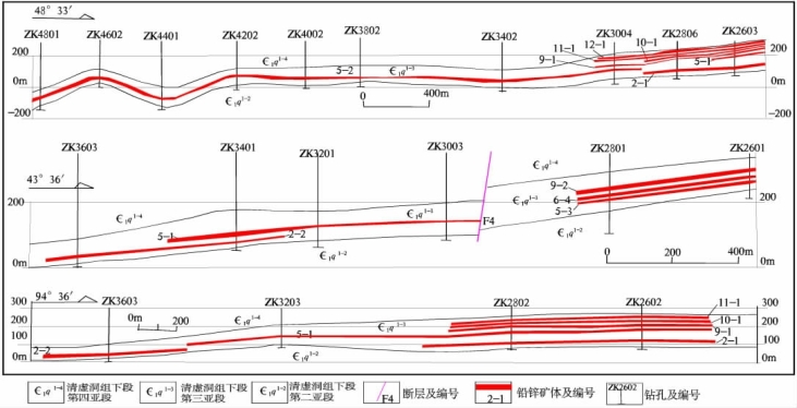 图2-15 花垣县清水塘铅锌矿区主要勘探线矿体连接对比图(据湖南省地质矿产勘查开发局405队,2015)