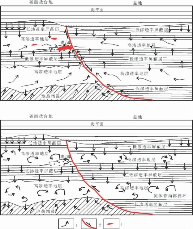 1.流体运移方向;2.断裂;3.铅锌矿体