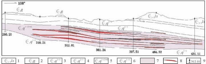 6.清虚洞组下段第二亚段;7.地质界线;8.铅锌矿体;9.钻孔及编号