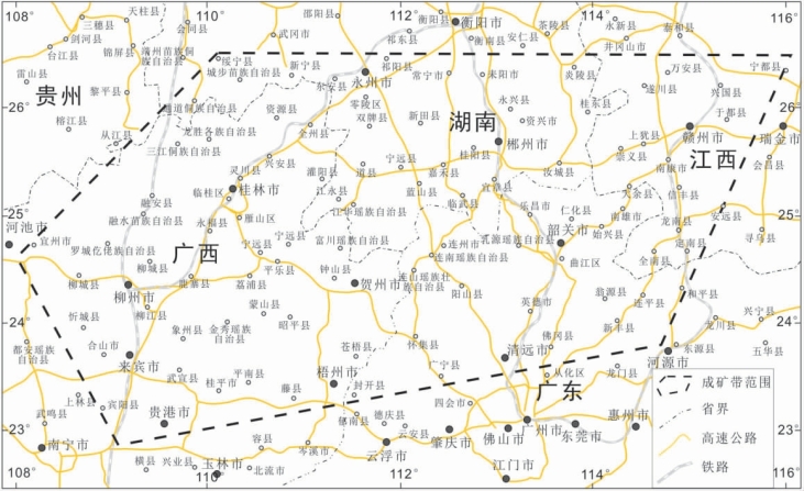 南岭成矿带位于华南中南部,范围涉及湖南、江西、广西和广东4省(区)20个地区(市)124个行政区县(图3-1)。主要拐点坐标:E116.00°,N26.5°;E114.61°,N23.83°;E109.15°,N22.89°;E108.08°,N24.62°;E110.09°,N26.56°,面积约23万km2。