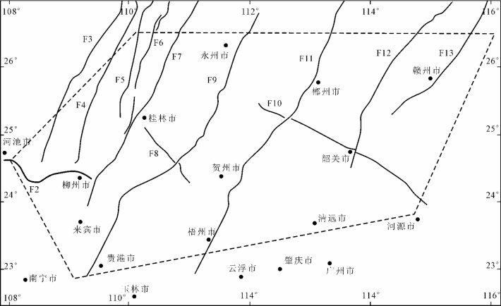 F2.河池-柳城断裂带;F3.溆浦-四堡断裂;F4.绥宁-三江断裂带;F5.新化-龙胜断裂;F6.桃江-城步断裂带;F7.邵阳-永福断裂带;F8.桂林-广州断裂;F9.双牌-都庞岭断裂带;F10.蓝山-连平(武冈-临武)断裂带;F11.茶陵-郴州断裂带;F12.万安-崇义(遂川-汝城)断裂带;F13.南城-大余断裂带