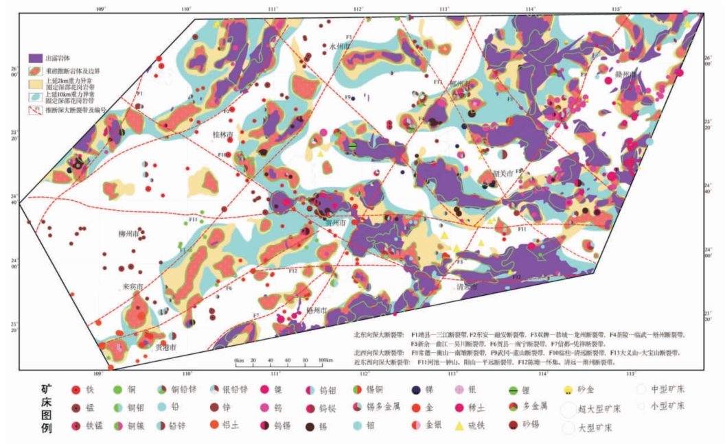 图3-3 南岭成矿带花岗岩类岩体及深断裂推断图