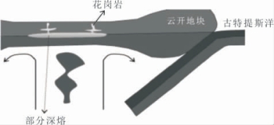 云开地区高州一带首次厘定了志留纪中酸性火山岩(安山岩、流纹岩)的存在(451~442Ma);中酸性火山岩的形成年龄与云开地区花岗岩类、基性侵入岩的形成时代基本一致(约445~430Ma),暗示云开地区早古生代存在较大规模的壳幔相互作用;中酸性火山岩及基性岩石的发现与研究,对于揭示云开地区的物质组成、形成演化及早古生代壳幔作用过程、构造背景等地质问题具有重要意义。初步认为云开地区加里东期中酸性火成岩的成因与古特提斯洋的向北俯冲有关(图4-4),云开地区加里东期具典型弧火山岩特征的基性岩类,均具有富集地幔源区特征,基性岩一致的岛弧/火山弧特征可能是继承自地幔源区(即存在一个包含了大量古老洋壳物质残余的岩石圈地幔),是陆内造山局部伸展环境下玄武质岩浆底侵作用的产物。