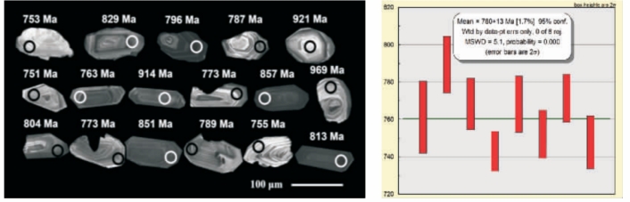 近年来系统的野外地质调查和室内综合研究表明,虽然鹰扬关岩组的岩性组合十分复杂,空间上变化较大,但不同层位的变质火山(碎屑)的锆石U-Pb测试结果却十分一致(850~758Ma),表明鹰扬关岩组的火山(碎屑)岩主要形成于新元古代(图4-2)。