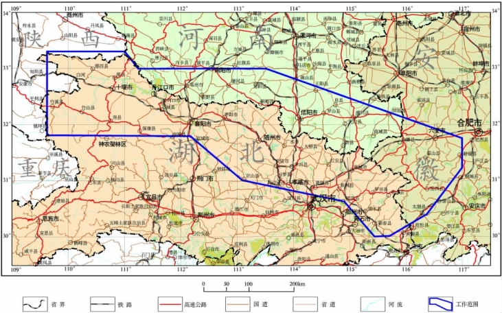 武当-桐柏-大别成矿带横跨湖北、河南、安徽三省。地理坐标极值范围为109°32′—117°00′,30°00′00″—33°15′00″。东西长约700km,南北宽120~210km,面积12.5万km2,其中湖北省7.6万km2、河南省3.0万km2、安徽省1.9万km2(图5-1)。行政区划涉及河南省南阳市、驻马店市、信阳市,湖北省十堰市、襄阳市、荆门市、随州市、孝感市、武汉市、黄冈市,安徽省六安市、安庆市等。
