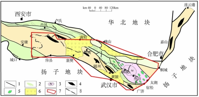 成矿带夹持于华北地块和扬子地块之间,是秦岭复合造山带的东延部分和根带(是中央造山带的重要组成部分),大地构造位置属秦岭褶皱系南秦岭-淮阳褶皱带。南界为青峰-襄樊-广济断裂,北界为确山-合肥断裂,东以郯庐断裂为界,西界为湖北与陕西、重庆的省界(图5-2)。地层发育齐全,主体包括北秦岭(中秦岭、北淮阳)、武当(丹江、两郧-武当山、平利-竹溪)、桐柏(随枣、桐柏)、大别(大别山)4个地层区8个地层小区,前寒武纪变质岩系大面积出露。岩浆活动频繁、分布广泛、岩石类型多样,以燕山期中酸性岩浆活动最频繁。变质作用强烈,大别地区是世界上出露规模最大、保存最好的超高压变质地体之一。构造活动强烈,深大断裂发育,主体构造线北西(西)-(南)南东向。多期复杂的构造改造及大量同构造增生岩浆物质的添加,使本区地质构造变得极其复杂,其形成与演化长期存在争议,Meng、Zhang(1997)和张国伟等(2001)提出基底形成阶段(Ar—Pt3 晚期)、板块构造演化阶段(Pt3 晚期—T2)、中新生代陆内构造演化阶段(T3—Q)三阶段演化模式,先后经历了扩张裂谷垂向加积、板块俯冲与碰撞、陆内俯冲收缩与伸展隆升等多阶段不同类型造山作用与过程。