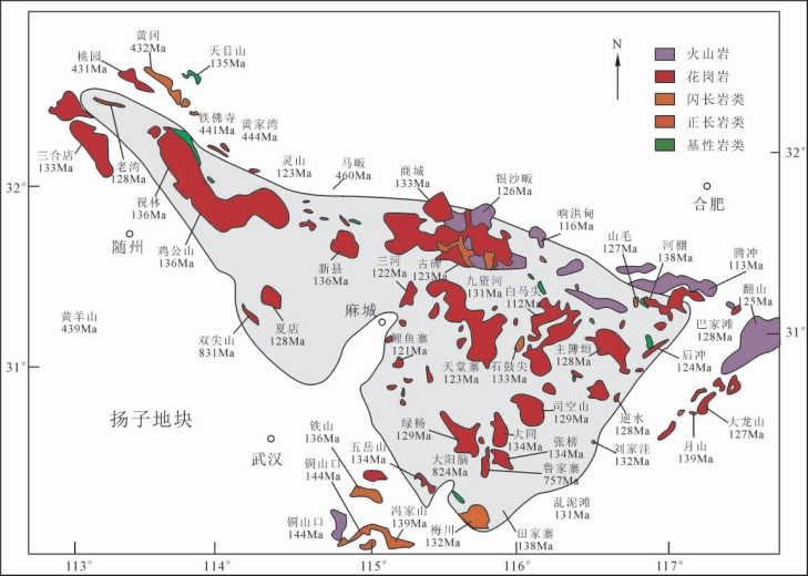 初步建立了武当-桐柏-大别地区侵入岩年代格架和构造-岩浆事件序列(图5-4、图5-5)。对构造格局和构造演化提出了许多重要新认识,对冈瓦纳超大陆、Pangea超大陆的聚合和裂解事件在武当-桐柏-大别地区的构造-岩浆响应取得了许多重要的新证据。