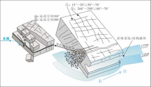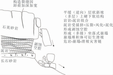 (2)三峡支流磨刀溪。下游滑坡的主要成灾模式包括与河道迁移密切相关的顺向(等倾)岸坡结构滑坡、横向或平缓层状岸坡结构崩塌衍生型滑坡、降雨型滑坡3类。崩塌的主要成灾模式包括剥蚀卸荷坐落型崩塌(图8-2)、侵蚀切蚀滑移式崩塌、降雨型崩塌3类。研究中可对应上述成灾模式提出针对性较强的区域预测与防治建议。