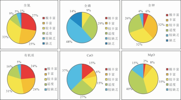 (2)植物必需的营养有益元素丰富。新田县富硒土地中全氮、有机质、硫、全钾含量较丰富,适度及丰富以上的分别达到95%、95%、96%、96%(图10-2)。