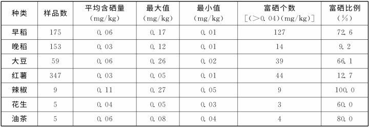 (6)大宗农产品普遍富硒。调查发现新田县境内有大量以传统种植方式生产的天然富硒农产品。主要富硒的大宗农产品有大豆、水稻、花生、辣椒、油茶、红薯等(表10-2)。其中,早稻、大豆、油茶、花生、辣椒的富硒样品比例较高,达60%~100%。