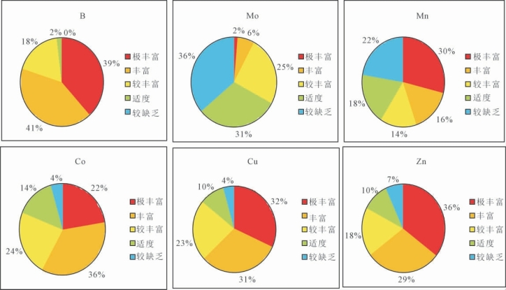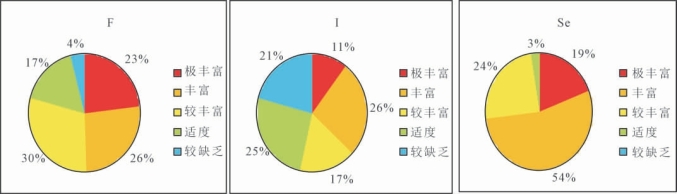 除硒外,硼、钴、铜、锌、氟的含量较丰富,适度及丰富以上的区域分别达到100%、96%、96%、93%、96%(图10-3、图10-4)。
