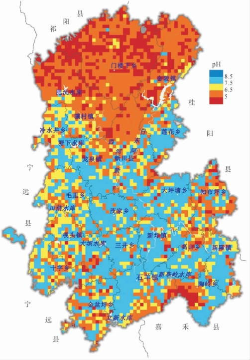 (4)土壤酸碱性分区特征明显。调查发现,新田县北部山地以酸性土壤为主,中部、南部丘岗地以偏碱性土壤为主(图10-5)。