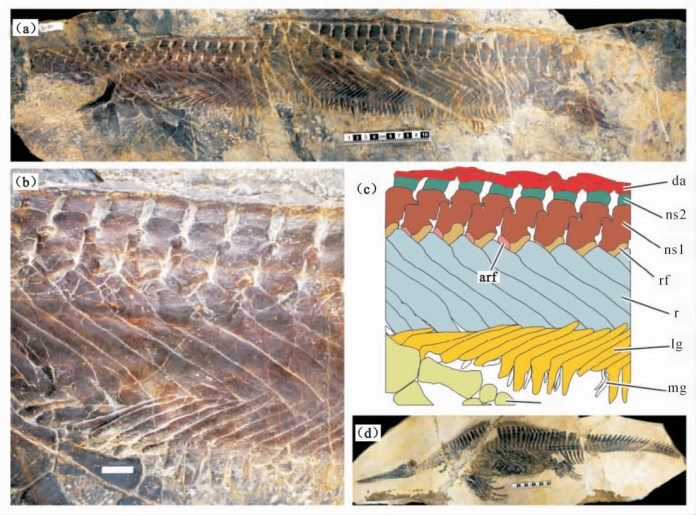 (a)长形似湖北鳄正型标本(WGSC V 26005);(b)长形似湖北鳄的肋骨;