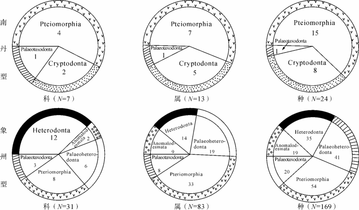 图11-13 广西泥盆纪象州型、南丹型双壳类(科属种)分异度对比图