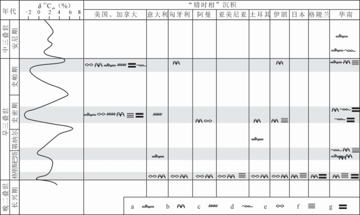 综合全球已报道的早三叠世“错时相”沉积,其分布主要集中在两个区域:其一是低纬度的特提斯地区,如西特提斯域的阿曼、伊朗、土耳其、亚美尼亚、匈牙利、波兰、意大利,东特提斯域的华南;其二是古大洋边缘地区,如现今的日本、美国西北部、加拿大西南部、格陵兰(图11-14)。时间上,“错时相”沉积紧接二叠纪末灭绝事件后产生,在整个早三叠世频繁出现,一直延续至中三叠世才告结束。值得注意的是“错时相”沉积在早三叠世表现出4个泛滥时期,即二叠纪—三叠纪界线附近、格里斯巴赫末期、史密斯早中期及早三叠世末,这4个集中分布时期与碳同位素的偏移存在良好的对应关系(图11-15)(赵小明等,2010)。