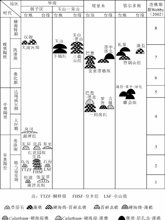 图11-1 中国奥陶纪生物礁类型和造礁期次划分