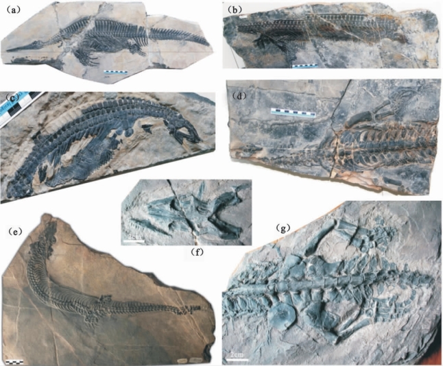 (a)湖北鳄,WGSC V 26004;(b)长形似湖北鳄,WGSC V 26005;(c)孙氏南漳龙,WGSC V 26006;(d)幻龙科,YIGM V 0940;(e)张家湾巢湖龙,YIGMR V 26001;(f)、(g)湖北汉江蜥,IVPP V 3231