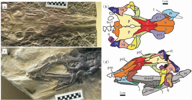 (c)孙氏南漳龙参考标本(WGSC 26006)的头骨;(d)孙氏南漳龙参考标本(WGSC 26006)的头骨素描