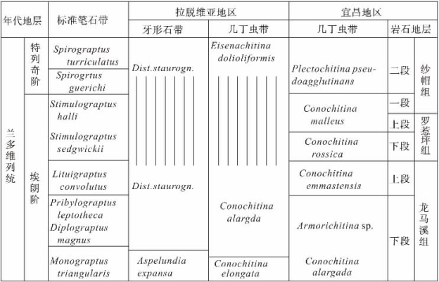 表11-1 宜昌地区志留系龙马溪组至纱帽组下部几丁虫序列及其对比