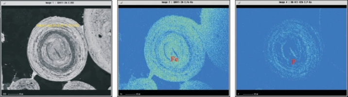 图11-33 鲕状赤铁矿与磷灰石的环带结构中Fe和P的面分布(电子探针)