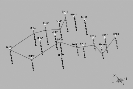 验证相邻钻孔地质一致性的过程如图2-8所示。例如,有18个钻孔在一个网格内,它们被命名为BH01到BH18。在三维空间可以看到每个钻孔的钻孔路径。每个钻孔路径顶部的黄色塔表示地面上的钻孔位置。岩芯描述根据钻孔井下深度用沿钻孔轨迹的彩色球体展示,这里的钻井都是垂直钻井,每个地质体都被表示为一种独特的颜色。例如,BH06被记录了13个岩芯描述,属于同个岩性的前3个岩芯用褐色球表示,属于同个岩性的中间的7个岩芯用绿色球表示,属于同个岩性的最后3个岩芯用深蓝色球体表示。图2-8中,大部分钻孔的顶部的绿色球可以被连接在一起(显示为红色的线),这意味着可以初步确定一个连续的岩性边界。然而,在BH03、BH07、BH11和BH12中,所有的岩芯样品被记录成相同的岩性(显示为深蓝色的球),在三维建模的后续过程中需要格外重视这四个钻孔。